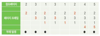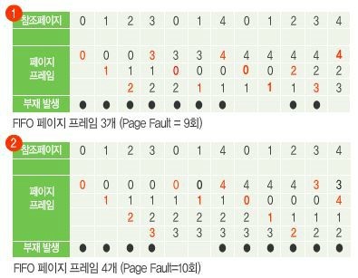 - Belady의 모순: 페이지를 저장할 수 있는 페이지 프레임의 갯수를 늘려도 되려 페이지 부재가 더 많이 발생하는 모순이 존재한다.
